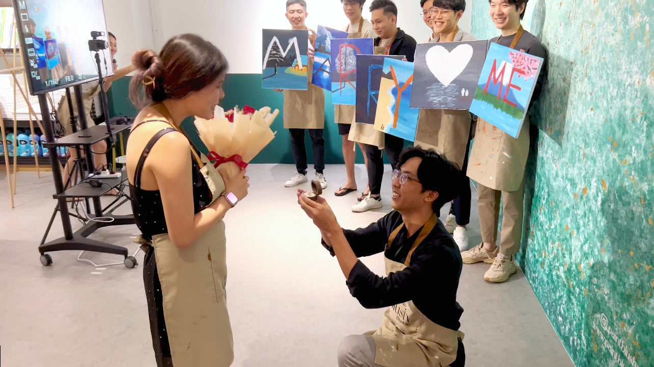 Would you like to make a surprise marriage proposal? We can help!! Painting theme can be paint each other (so both of you will sit opposite each other), or anything you want. Package includes soft verbal guidance, all arrangements prior & during with the proposed person, coordinate with your friends/family (if needed), providing a finished social media video of your proposal process, a bouquet of flower + 2 glass of red/white wine for your celebration!