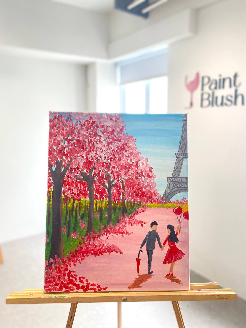 Couple holding hands, guy holding umbrella and girl holding balloons, walking towards the Eiffel Tower
